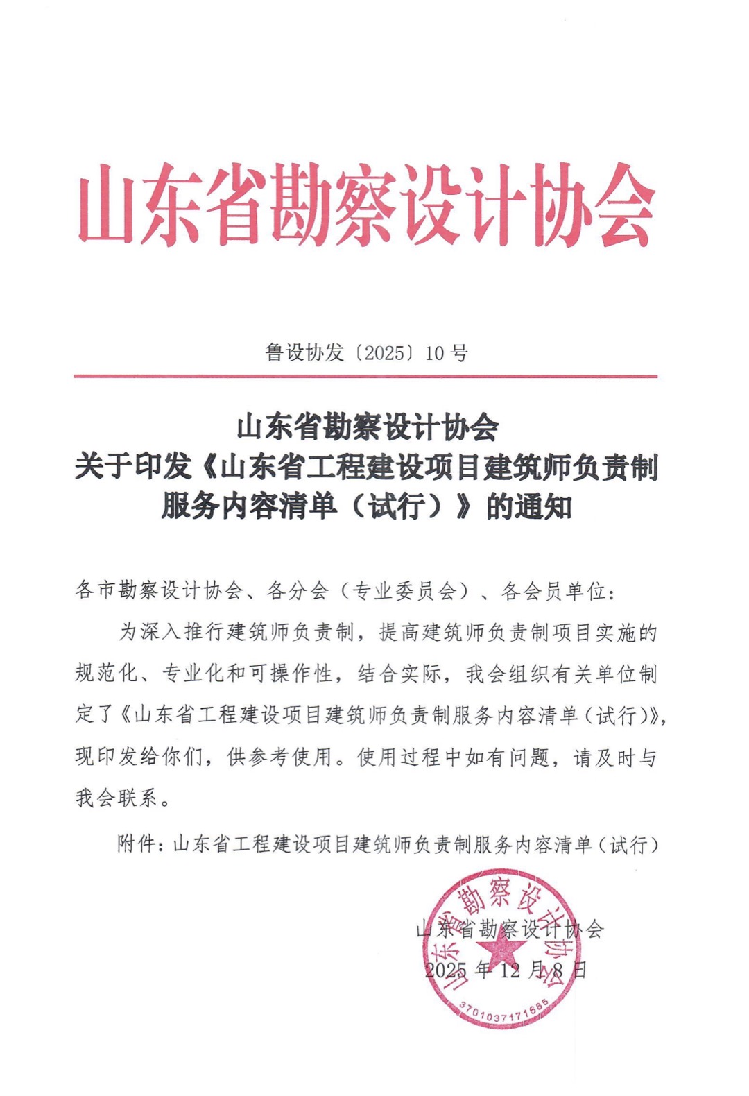 山东省勘察设计协会关于印发《山东省工程建设项目建筑师负责制服务内容清单(试行)》的通知